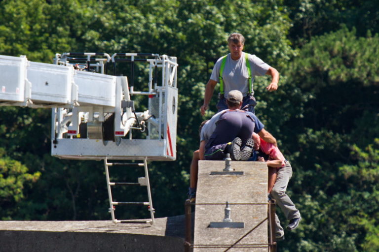 "Muž vyliezol na mostný oblúk s fľaškou a cigaretami. Fľaša mu spadla do vody, tak si zapálil cigaretu a fajčil. Vtedy už bol pri ňom policajný vyjednávač. Rozprával sa s mužom a prehováral ho, aby neskákal. Hasiči pritom prichystali vysokozdvižnú plošinu a pristavili ju k oblúku. Na plošine sa k mužovi vyviezol jeden hasič. Muža chceli naložiť na plošinu, no ten sa nahol a chcel skočiť. Zachytili ho, spacifikovali a uložili na plošinu," popísal nám priebeh udalosti očitý svedok.