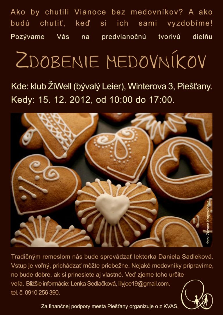 Občianske združenie KVAS vás pozýva na vianočné zdobenie medovníkov, ktoré sa uskutoční 15. decembra od 10.00 do 17.00 hod na Winterovej ulici 3 (bývalý Leier) – Klub ŽiWell.