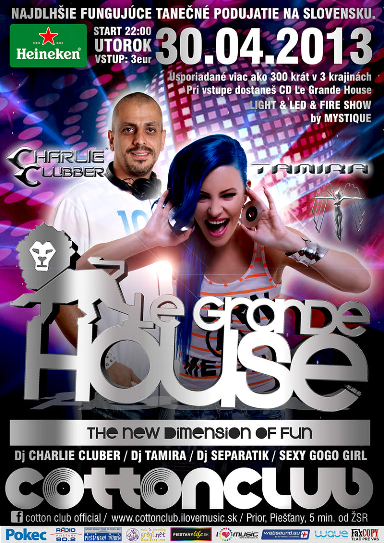 O support sa postará rezidentný dj Cotton Clubu,Separatik. Okrem toho o zábavu sa postará zaujímavý muž, menom MYSTIQUE so svojou ohnivou a svetelnou show a sexi GOGO tanečnica. Pri vstupe každý návštevník dostane cd Le Grande House 2.