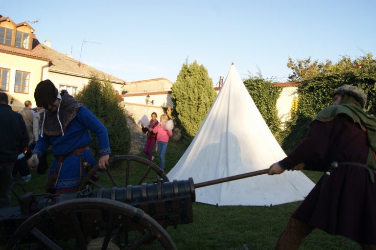 To už kúriu obsadilo spoločenstvo Bludných rytierov. Na nádvorí si rozbili stredoveký tábor s dobovou kuchyňou, remeselníkmi i delostreleckou jednotkou. Ženy piekli posúchy, ktoré potierala Zdenka Kosorová slaninkou na cibuľke či akýmsi lekvárom. „To sú sušené slivky s hrozienkami vyvarené v červenom víne, dochutené škoricou, muškátovým orechom, medom a šafránom,“ vysvetlila nám táto bludná rytierka.