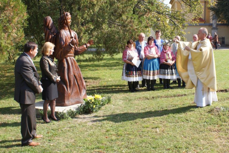 Autor diela je ľudový rezbár Jozef Chromek z Podolia. Počas hodov ju v nedeľu 29. septembra slávnostne posvätil správca farnosti Dušan Nemec. Pri tejto príležitosti starostka Eva Směřičková vo svojom príhovore uviedla: „Myšlienka dať zhotoviť a umiestniť sochu v obci vznikala postupne. Pred pár rokmi vekom vyschla lipa pri soche svätého Jána Nepomuckého a bolo ju potrebné s dvoma ďalšími, ktoré ohrozovali bezpečnosť občanov, vyrezať. Zostali tak tri kmene, jeden väčší a dva menšie. Na naše šťastie sa do susednej obce prisťahoval ľudový rezbár Jozef Chromek, ktorého sme navštívili a požiadali ho, či by nebol ochotný niečo vytvoriť.“