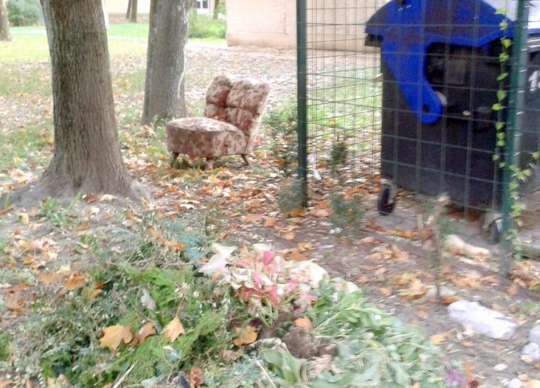 Za činžiakmi na Ul. A. Hlinku sme pri kontajneroch našli staré kreslo, ktoré tu drieme už asi tri mesiace, o kúsok ďalej stoličky a ďalší odpad.