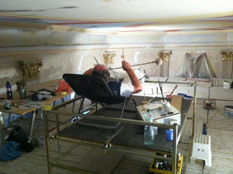 „Priestor kúpeľnej kaplnky bol pre nás viacrozmernou výzvou. Jej vtedajší stav môžeme rozdeliť na technickú a výtvarnú stránku. Bolo potrebné spevniť strop, aby vydržal, a výtvarne celý priestor zharmonizovať a zviazať s architektúrou. Zámerom bolo ešte intenzívnejšie naviazať vzhľad na patrocínium (zasvätenie kostola – pozn. red.), na Božské Srdce,“ povedal pre Piešťanský týždeň Peter Čambál ml.
