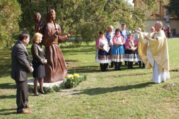 Dva a pol metra vysoká drevená socha svätého Michala Archanjela skrášľuje park medzi pobedimskou farnosťou a kostolom rovnomenného mena.