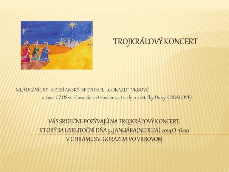 Mládežnícky kresťanský spevokol Gorazd Vrbové a žiaci CZUŠ sv. Gorazda vo Vrbovom vás srdečne pozývajú na Trojkráľový koncert, ktorý sa uskutoční v nedeľu 5. januára o 16:00 v chráme sv. Goradza vo Vrbovom.