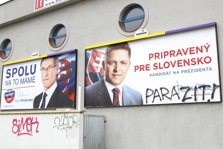 Konkrétne na Bratislavskej ceste pri benzínovej pumpe Slovnaft zapracovala ľudová „tvorivosť“, ktorá doplnila profil jedného z horúcich kandidátov na prvú hlavu štátu. Do fotografie sa už nezmestil tretí reklamný pútač istej poisťovne, ktorý v tesnom susedstve oboch predvolebných bilboardov hlása: „LEN ŽIADNU PANIKU! Teraz aj stret so zverou alebo výtlky, alebo úraz zadarmo.“ Škoda len, že proti takýmto udalostiam sa poistiť dá. Voči vyčíňaniu vandalov nie.
