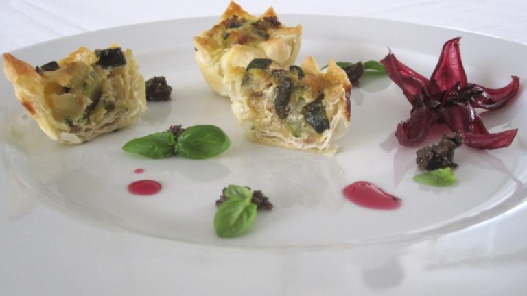 šalotka 60 g, cuketa 100 g, lístkové cesto 80 g, smotana 33 % 40 ml, vajce 1 ks, olivový olej, soľ, mleté čierne korenie, biele víno