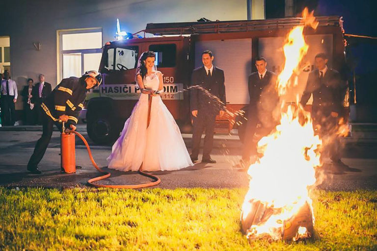 Originálnu svadbu aj s hasením ohňa, zapnutými sirénami a hasičmi v zásahových oblekoch zažila obec Pobedim. Dobrovoľný hasič Martin Kováčik si bral dcéru predsedu Dobrovoľného hasičského zboru (DHZ) v Čachticiach, Michaelu Moravanskú. Na svadbe boli dva živly – oheň i voda.