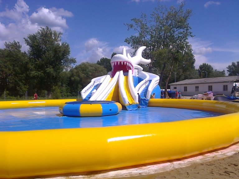 Do areálu s rozlohou 13 500 metrov štvorcových už naviezlo 60 ťahačov 1 200 ton bieleho piesku. Pracovníci osadili prakticky všetky segmenty vrátane hlavného bazéna s dĺžkou 40 metrov a v stredu otestovali tiež nafúknutie hlavnej atrakcie, ktorou je 13,6 metra vysoký žralok, z ktorého ústi do bazéna šmykľavka.
