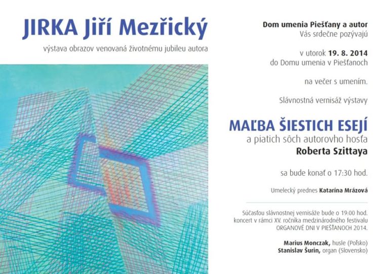 Dom umenia Piešťany a autor Vás srdečne pozývajú v utorok 19. 8. 2014 do Domu umenia v Piešťanoch na večer s umením. Slávnostná vernisáž výstavy MAĽBA ŠIESTICH ESEJÍ a piatich sôch autorovho hosťa Roberta Szittaya sa bude konať o 17:30 hod. Umelecký prednes Katarína Mrázová.
