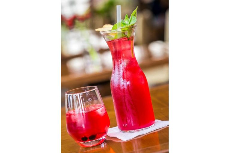 Do pollitrového džbánu nalejeme 4 cl domáceho sirupu zázvor – ibištek. Pridáme 4 cl domácej grapefruitovej šťavy, kocky ľadu, čerstvé ovocie, zalejeme vodou a zľahka premiešame.