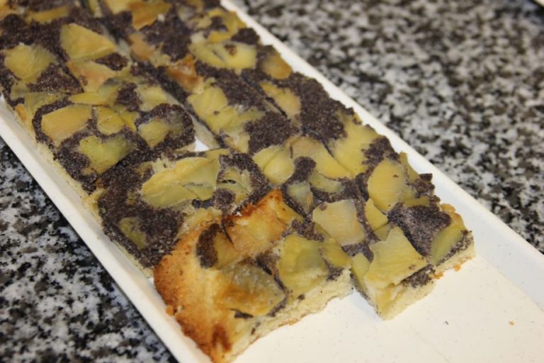 SUROVINY: 1 kg jabĺk, 0,5 kg práškového cukru, 6 vajec, 200 ml mlieka, 200 ml oleja, 0,3 kg polohrubej múky, 0,15 kg pomletého maku, 1/2 balíčka kypriaceho prášku do pečiva, čokoládová poleva