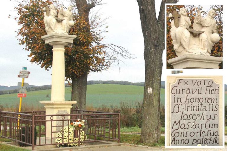 Na podstave pomníka je nápis EX VOTO Curavit fieri in honorem S.S. Trinitatis Josephus Maszar cum consorte sua Anno patechat 1791, čo vo voľnom voľný preklade znamená: Na slávu a česť Najsvätejšej Trojice venoval Jozef Masár s manželkou Annou v roku 1791.