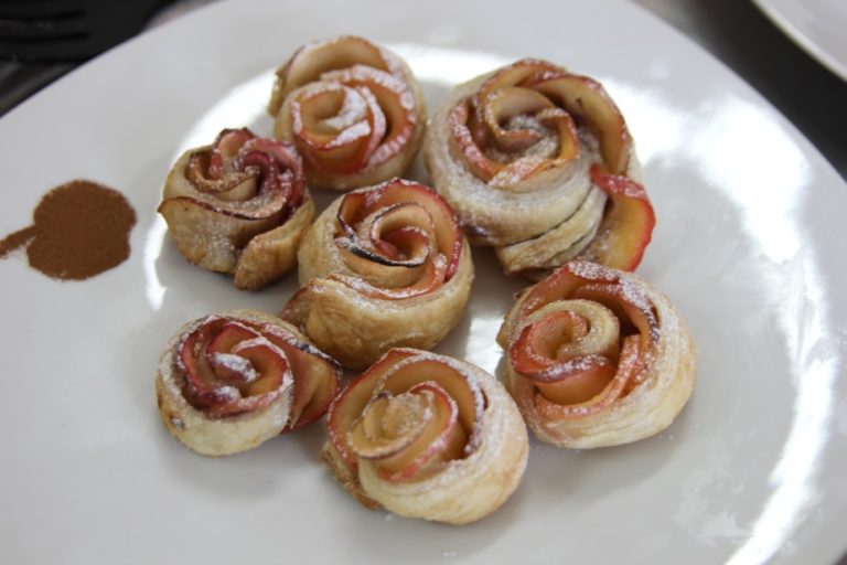 Najskôr si jablká nakrájame na tenšie plátky, cca 2-3 mm. Tie dáme asi na 3 minúty povariť do vody s cukrom, klinčekmi a škoricou. Medzitým si rozvaľkáme lístkové cesto, 1-2 mm. Nakrájame na 3 cm dlhé prúžky podľa jabĺk – 5 ks uložených cez seba po dĺžke. Jabĺčko musí presahovať cez okraj cesta. Zvinieme do tvaru ruže. Dáme na plech vyložený s papierom na pečenie a pečieme pri 200 oC cca 20 minút. Po vychladnutí posypeme práškovým cukrom.