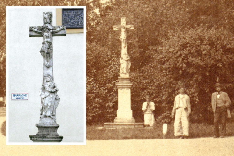 Kríž s Ukrižovaným umiestnený pri Kostole sv. Štefana kráľa stál pôvodne v časti Teplice neďaleko barokovej Kaplnky sv. Jána Nepomuckého, v priestore hlavného vstupu do parku. Po zbúraní kaplnky koncom 19. storočia ho premiestnili na iné miesto v parku – medzi Kursalon a hotel Royal (Slovan). Kríž pochádza z roku 1791. Je zhotovený z pieskovca, pod ním stojí Panna Mária. Je pravdepodobne dielom kamenárov z Dobrej Vody.