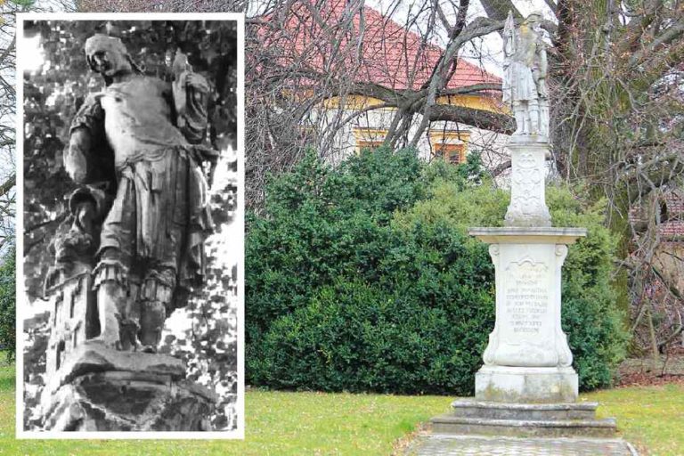 Socha svätého Floriána v Rakoviciach sa tak trochu vymyká z nášho seriálu. Stojí síce popri hlavnej komunikácii, no sčasti ho ukrýva zrenovovaná klasicistická brána do parku kaštieľa.