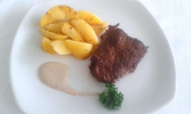 Cibuľu nakrájame na kolieska a opražíme na oleji. Keď chytí zlatu farbu, pridáme na plátky nakrájanú, osušenú, osolenú a okorenenú roštenku a zľahka opečieme po oboch stranách. Podlejeme tmavým pivom a necháme pár minút podusiť. Zemiaky vložíme do osolenej vody a varíme. Uvarené ich dáme na plech, posypeme rascou, prípadne štipkou čierneho korenia a dáme zapiecť do rúry na 15-20 minút.