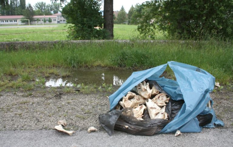 Na Sadovej ulici v Piešťanoch ktosi vyhodil igelitové vrece plné kostí z čeľustí a hlavy prasiat. Odpadky objavila naša čitateľka vo štvrtok 28. mája ráno po ceste do práce. Vrece sa nachádzalo za ihriskom Základnej školy na Mojmírovej ulici v priestore medzi cestou a areálom športoviska.