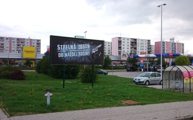 Propagácia násilia alebo snaha tajomnej obchodnej spoločnosti zvýšiť predaj strelných zbraní na Slovensku? Určite si viacerí z nás položili túto otázku pri zhliadnutí reklamného bilbordu na okraji parkoviska pri piešťanskom Tescu.