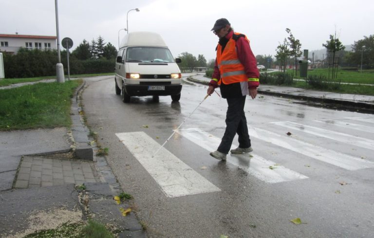 Po bielej zebre s bielou palicou v dennom svetle, ale pri zatiahnutej oblohe a občasnom daždi, prechádzal vo štvrtok 15. októbra na Hlbokej ulici v Piešťanoch slabozraký