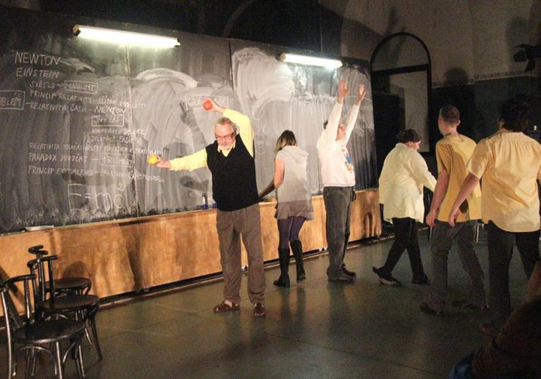 Otec predstavenia, režisér Jiří Havelka, rozdelil hru do dvoch častí. V prvej sa diváci z názorných príkladov a písaných údajov na tabuli dozvedeli, ako teória relativity funguje. Doplnené humornými dialógmi sa i fyzikálne záležitosti zrazu zdali malinou, návštevníci sa usilovne zapájali a preukázali i znalosti údajov o rýchlosti svetla. A tak po dôkladnom vysvetlení a zopakovaní problematiky mohli protagonisti plynule prejsť k druhej časti. V nej na príklade vlaku a jeho príchodov a odchodov zo stanice ukázali všetko, o čom v prvej polovici prednášali.