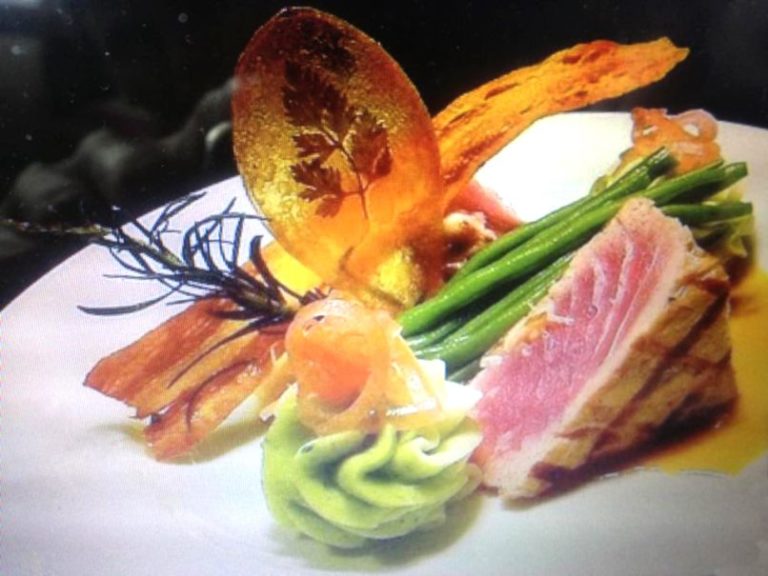 Bazalkovo-zemiakovú kašu si dáme do cukrárenského vrecka a ozdobíme tanier. Tuniaka prekrojíme na polovicu a uložíme na tanier aj s fazuľovými luskami a chrumkavým prosciuttom, dozdobíme oblanšírovanými cherry paradajkami bez šupky a vetvičkou rozmarínu.