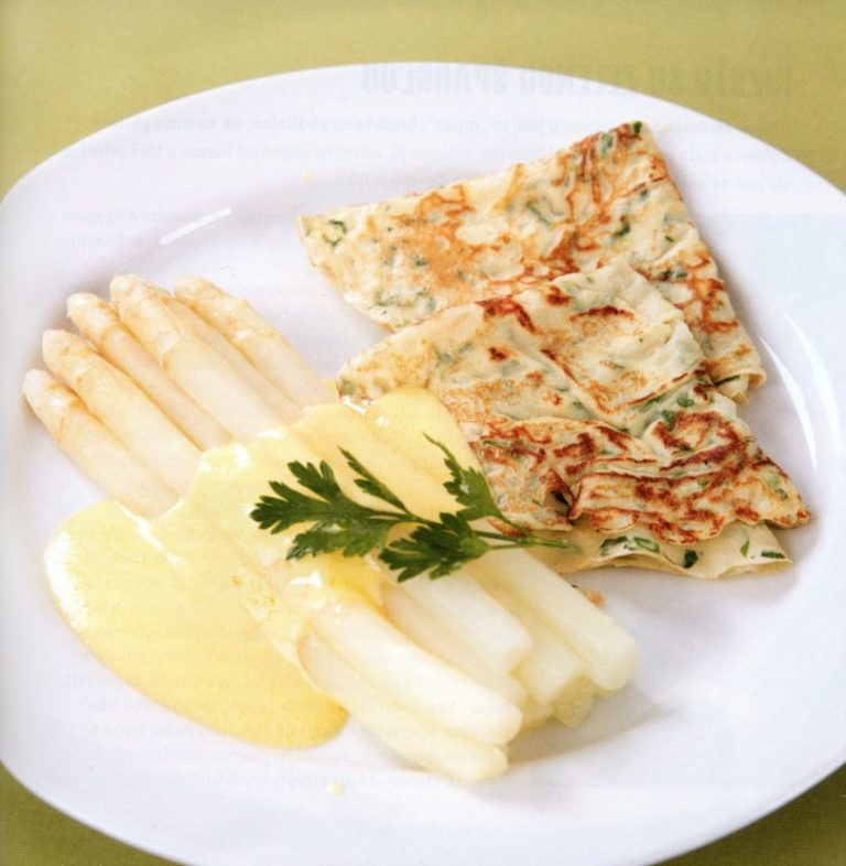 Keďže táto omáčka chutí najlepšie úplne čerstvo urobená a teplá, kým začnete liať do žĺtkov maslo, dajte variť na 7 minút ošúpanú špargľu. Do vody dajte trochu masla, soli a práškového cukru. Na predhriaty tanier položte zrolovanú alebo zloženú palacinku a vedľa nej špargľu, ktorú polejete famóznou holandskou omáčkou.