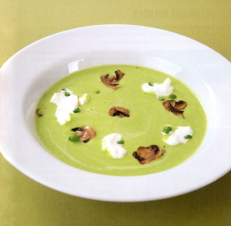 Zvyšnú tretinu hrášku minútu povarte v druhej polovici vývaru a potom zmiešajte s rozmixovanou a prepasírovanou hráškovou zmesou. Polievku ďalej nevarte, už je uvarená, zbytočne by stratila farbu. Pridajte orestované šampiňóny (dajte ich restovať hneď na začiatku, lebo to potrvá asi 10 minút), a ak chcete, tak vyšľahanú šľahačku s trochou citrónovej kôry. Trochou, koniec koncov, varíte hráškovú polievku. Ako dekoráciu použite lístky mäty.