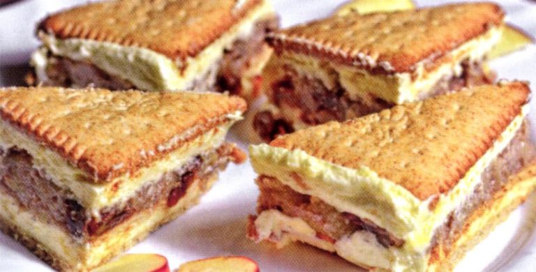 Koláč: Formu vymastíme maslom alebo vyložíme alobalom. Na dno poukladáme prvý balíček keksov a potrieme polovicou vanilkového krému. Nasleduje ďalšia vrstva keksov, na ňu vychladnutá jablková náplň a druhá časť vanilkového krému. Navrch poukladáme opäť keksy. Múčnik vložíme na niekoľko hodín, najlepšie na noc, do chladničky.
