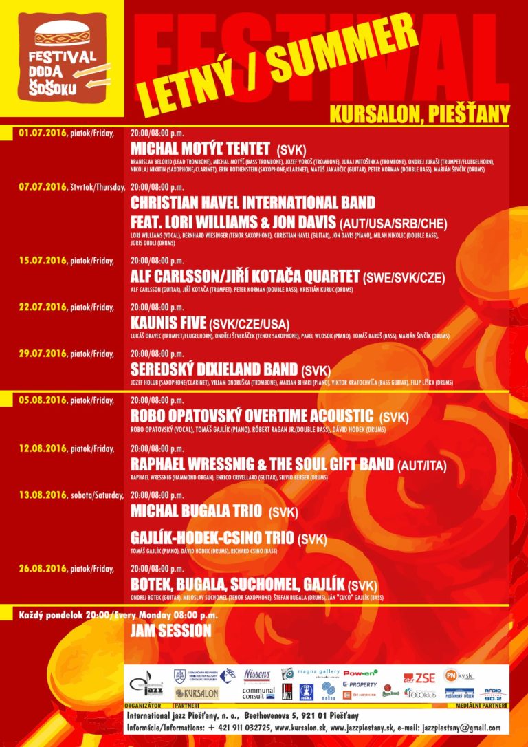 Začali sme v piatok 1.7.2016 skvelým koncertom tentetu Michala Motýľa, vo štvrtok 7.7.2016 sme pokračovali medzinárodným projektom: Christian Havel International Band s vynikajúcou speváčkou Lori Williams (USA) a v piatok 15.7.2016 sa Vám predstavilo zoskupenie Alf Carlsson/Jiří Kotača Quartet. Pripravili sme pre vás ďalších 7 koncertov a pondelkové jam session. Príďte stráviť príjemné večery na terase Kursalonu a vypočuť si svetový jazz.