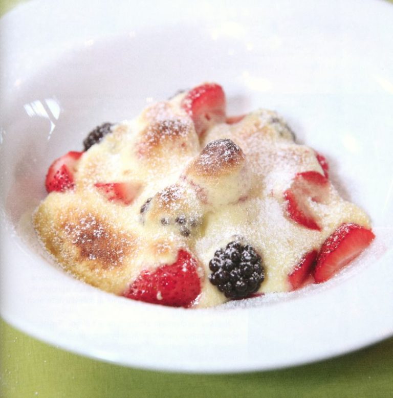 Kým sa žĺtky šľahajú, pekne naukladajte rôzne lesné plody (maliny, černice, ríbezle, čučoriedky, brusnice, jahody, čo len chcete) do hlbokých tanierov alebo menších zapekacích misiek, každú porciu zvlášť.