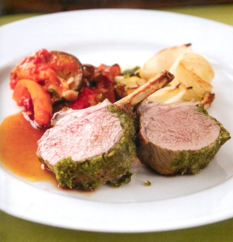 Jahňacinku zvrchu potrite budúcou krustou, na pekáč dajte bižutériu z panvice (teda cesnak, papriku, rozmarín) a na ňu položte obe jahňacie kotletky. Dajte do rúry vyhriatej na 180 °C na 15 až 20 minút.