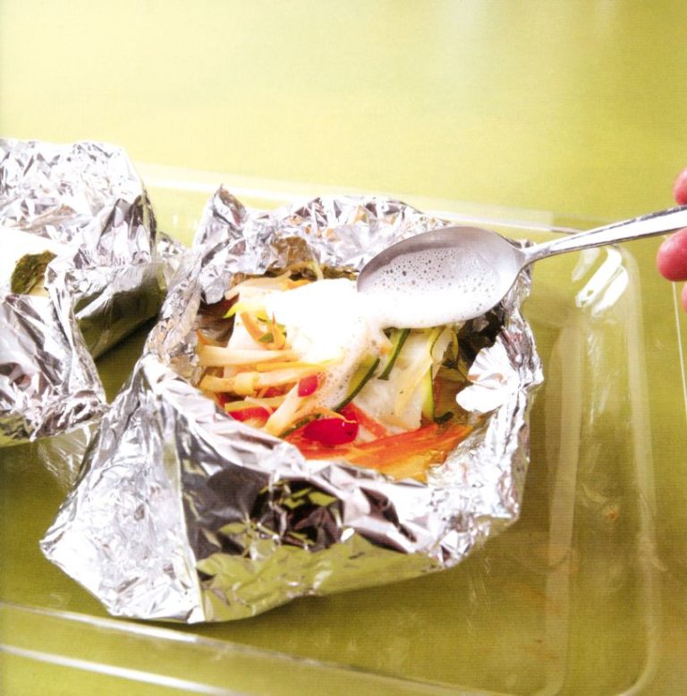 Potom už len zubáča efektne otvorte (alobal roztrhnite dvomi vidličkami), trochu premiešajte julienne a polejte limetkovou omáčkou (do studeného plnotučného mlieka nastrúhajte trochu limetkovej kôry a rozšľahajte ponorným mixérom) a s postrannými úmyslami podávajte.