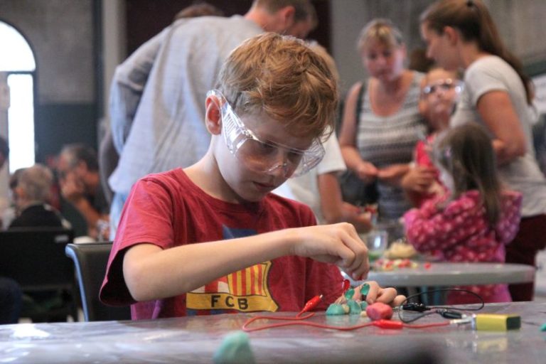 V historickej budove sa tak netradične zapájali obvody. „Vykonávali sme to pomocou netradičných vodivých materiálov, plastelíny, LED diód, batérií a krokosvoriek. Deti si vyskúšali paralelné i sériové zapájanie elektrických obvodov,“ uviedla lektorka Magdaléna Masárová. Išlo pritom o veľmi jednoduchú hravú fyziku, ktorú zvládali s rodičmi aj malé deti.