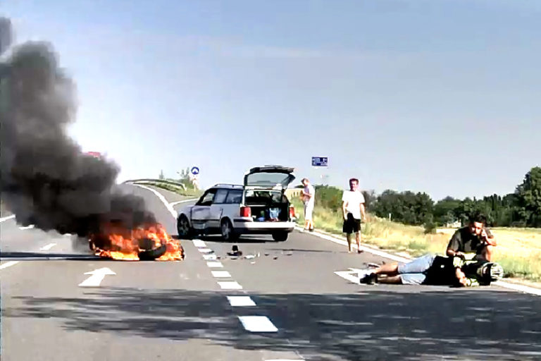 Na obchvate Trnavy sa v stredu 2. augusta po pol deviatej ráno stala vážna nehoda motocykla a osobného auta. Po zrážke začal motocykel horieť a hustý dym i šľahajúce plamene prilákali viacero policajných hliadok. Pri nehode sa zranil 23-ročný Maduničan, ktorému policajti ihneď poskytli predlekársku pomoc do príchodu, ďalší z policajtov hasil motorku. Zranený muž sa nachádzal vo vážnom stave a strácal vedomie. Dopravní policajti neskôr zistili, že nehodu zavinil 50-ročný vodič auta, ktorý za nadjazdom zišiel na pravú krajnicu pripájacieho pruhu a začal sa na obchvate otáčať. Policajti PMJ mu navyše namerali v dychu 0,77 promile alkoholu. Na mieste mu zadržali vodičský preukaz a ďalšiu jazdu mu zakázali. Motorka bola požiarom úplne zničená a škoda bola odhadnutá na 4500 eur. Dopravná nehoda je stále v štádiu vyšetrovania.