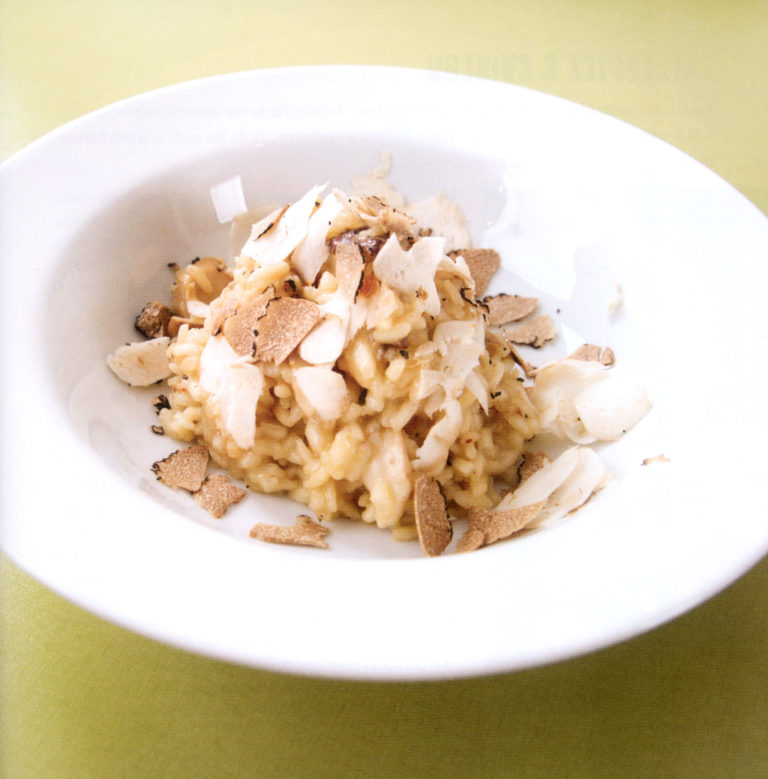 Ide sa servírovať. Rizoto naberte do hlbokých, podľa možnosti predhriatych tanierov, navrch postrúhajte parmezán (preto nešiel žiaden parmezán do samotného rizota, ale vy to smelo vyskúšajte), a ak to chcete s chuťou vyšpičkovať, pridajte ďalšiu exkluzívnu hubu – nastrúhanú hľuzovku.