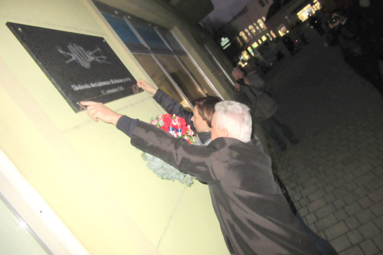 Tých pár odhodlancov sa v závere spomienkového podujatia pobralo k pamätnej tabuli s vyobrazením zaťatej päste držiacej ostnaté drôty a textom: „Slobodu dosiahneme hľadaním pravdy.“ Na budovu ČSOB banky ju v roku 2013 inštalovalo občianske združenie Pro Civitate.
