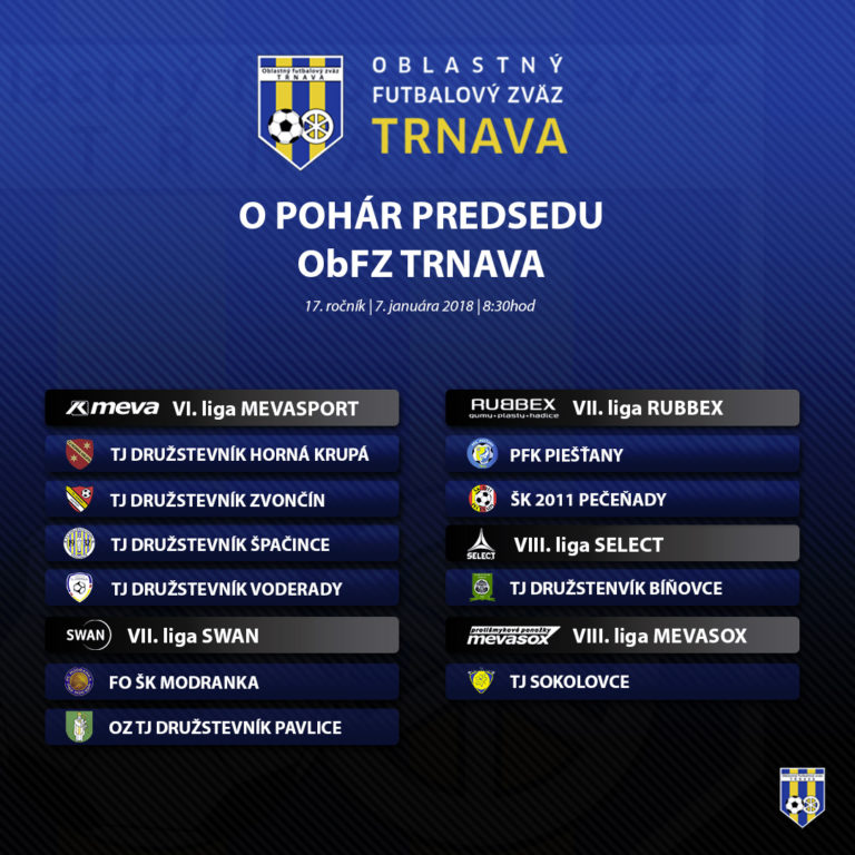 Zo siedmych líg budú o pohár bojovať prvé dve mužstvá. Z trnavskej časti SWAN to budú Modranka a Pavlice, ktoré si umiestnenie na čele tabuľky udržiavali takmer celú jesennú časť. Zo siedmej ligy RUBBEX budú štartovať prvé Piešťany a druhé Pečeňady. Z ôsmych líg si na turnaji zabojujú jesenní víťazi, ktorými sa stali Sokolovce (MEVASOX) a Bíňovce (SELECT). Na turnaji si teda celkovo zahrá až desať mužstiev, ktoré budú rozdelené do dvoch skupín. Podľa slov predsedu ObFZ Trnava, Vladimíra Hracha, očakávajú od tejto novinky väčšiu atraktivitu pri meraní futbalových síl.