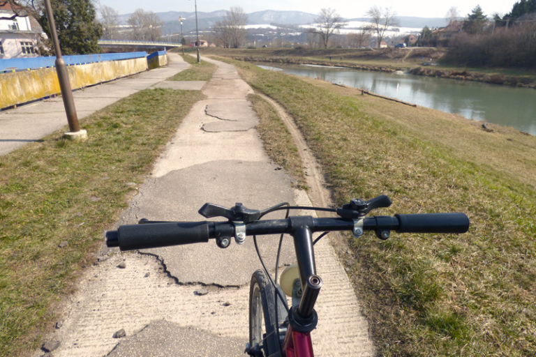 Ďalším nelichotivým úsekom na bicyklovanie v Piešťanoch je starý známy chodník, ktorý takisto vedie po vale, ale pri Obtokovom ramene Váhu poza liečebný dom Irma a zrecie bazény. Udupaná a vychodená hlina s pozostatkom štrku, ktorý tam bol pred pár rokmi navezený, je relatívne nebezpečným úsekom pre bicykel.