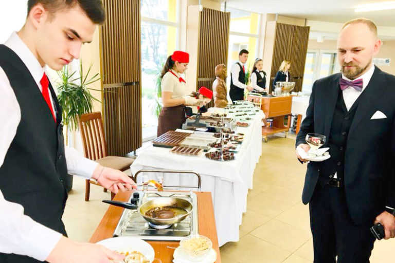Študenti odprezentovali to najlepšie, čo sa naučili, a na prítomných riaditeľov čakali okrem ručne robených praliniek, čokoládových lízaniek a flambovaného ovocia či zmrzliny aj profesionálne pripravená káva od cenami ovenčených študentov-baristov.