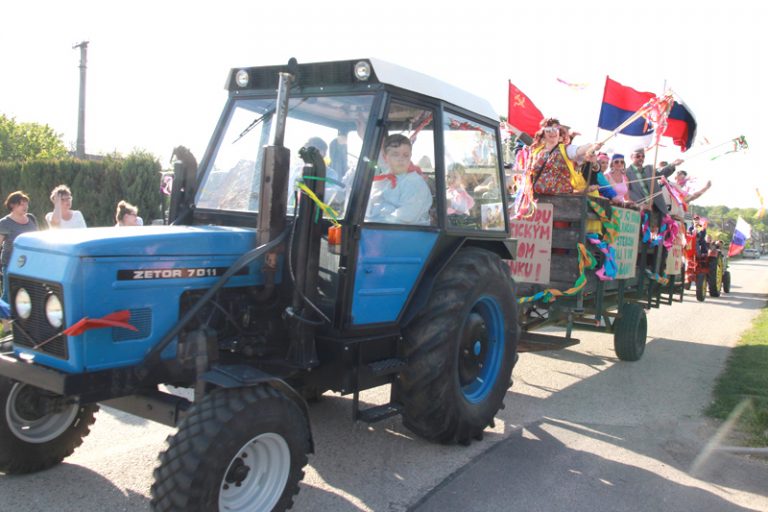 Vo vlečke stáli Podhoranci nadšene mávajúci ľuďom zástavami i mávadlami. Za veľkým išiel malotraktor ovenčený červeným plátnom oslavujúcim VOSR. Pri traktoristovi sedel jeho vnúčik s budajkou na hlave. Na vlečke, kde stáli nápisy „Lepšá slanina jako hlava Lenina“ a „Do nefajčí, nech robí!“, sa viezla mladá dvojica pod skríženými zástavami ČSSR a ZSSR.