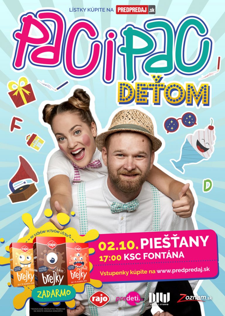 Zapojte sa do súťaže v Piešťanskom týždni a vyhrajte vstupenky pre celú rodinu na šou PACI PAC – DEŤOM, ktorá sa bude konať 2. októbra v KSC Fontána v Piešťanoch. Na deti a ich rodičov čaká bohatý program plný obľúbených pesničiek, hudby, tanca a zábavy. Vstupenky môžete vyhrať zaslaním SMS v tvare: win(medzera)pacipac(medzera)telefónne číslo na skrátené číslo 6660 do nedele 23. septembra do 20.00 h. Cena spätnej SMS je 1,20 € s DPH. Dvoch výhercov, ktorí získajú po štyri vstupenky, budeme telefonicky kontaktovať. Službu SMS poskytuje A SMS, s.r.o.