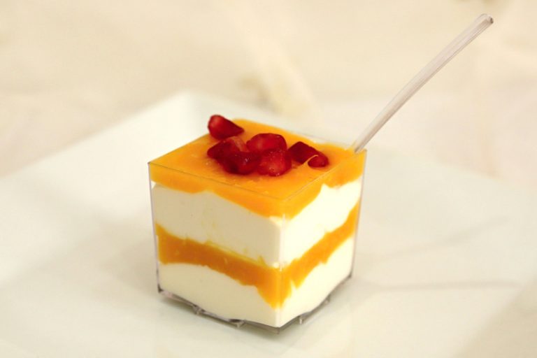 Tento dezert sa servíruje v pohárikoch – buď použijete sklené napríklad od detskej výživy, alebo plastové. Postupne vrstvíme krém a mandarínkový puding. Vrchnú vrstvu bude tvoriť mandarínkový puding, na ktorý môžeme poukladať buď zrniečka granátového jablka, alebo drobné ovocie ako maliny, jahody, čučoriedky a medovkový list.