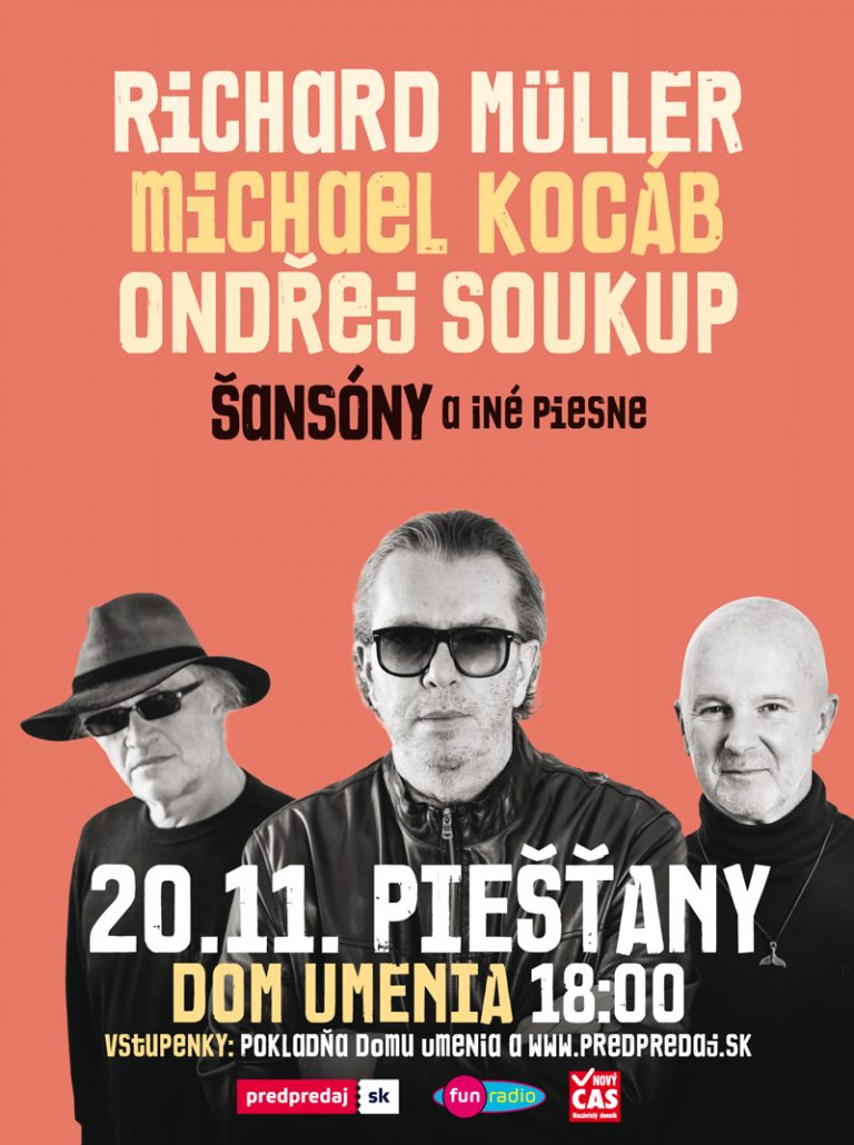 S projektom Šansóny a iné piesne pricestuje v novembri Richard Müller spolu s hosťami Michaelom Kocábom a Ondřejom Soukupom aj do piešťanského Domu umenia. Koncertný program bude pozostávať zo šansónových piesní z autorskej dielne Hapka/Horáček s tematicky nosným albumom V penziónu svĕt. V programe zaznejú menej hravé piesne z diskografie R. Müllera i overené hity v skvelých aranžmánoch sprievodnej skupiny.
