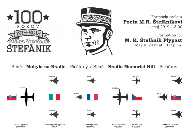 Blížiaca sa celoštátne oslavy 100. výročia úmrtia Milana Rastislava Štefánika sa stanú aj neopakovateľnou medzinárodnou leteckou udalosťou. V sobotu 4. mája preletí ponad mohylu na Bradle a letisko Piešťany jedinečná zostava lietadiel štyroch krajín, ktoré sa bytostne spájajú so životom a osudmi M. R. Štefánika ako vedca, pilota, vojaka a štátnika. Majestátnu vzdušnú poctu generálovi vzdajú stíhacie a dopravné stroje v dvanásťčlennej zostave leteckých síl Slovenska, Českej republiky, Francúzska a Talianska.