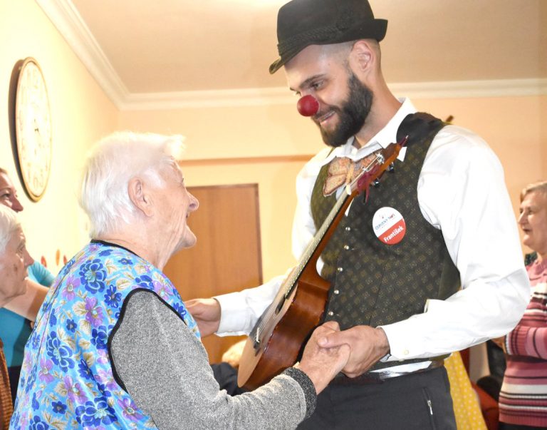 V žltých bodkovaných šatočkách, s červeným nosom na gumičke, vlasy zopnuté do drdolu a biele kvietky v ňom. Na tvári široký úsmev. Jej partner – v tirolských rajtkách, s nádherným ako živým motýlikom na bielej košeli, na hlave klobúk, cez plece malá gitara. A na nose – tak ako jeho partnerka šašuľka – červená hahuľa. Takto vyparádení prišli zdravotní klauni do zariadenia Senior Modrová.