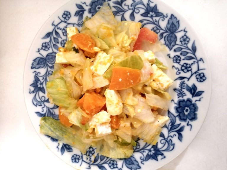 Ľadový šalát pokrájame a dáme do misy. Pokvapkáme citrónom. Pridáme na kocky nakrájaný syr balkánskeho typu, soľ a korenie. Ošúpanú tekvicu zbavenú jadrovníka nakrájame na mesiačiky a dáme piecť na plech vystlaný papierom na pečenie. Pečieme asi 20 minút na 180 oC. Upečené mesiačiky Hokkaida nakrájame na plechu ešte na menšie kúsky a pridáme do šalátu. Pokvapkáme olivovým olejom a premiešame. Môžeme podávať ako prílohu k jedlu alebo ako samostatný pokrm s čiernym chlebom.