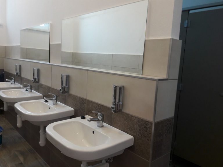 Vymenený bol obklad i dlažba, inštalovali sa nové WC kabínky, deliace steny medzi pisoármi z HPL dosák, jednopákové stojankové vodovodné batérie, sanita, osvetlenie, zásuvky, elektroinštalácia vo vnútorných priestoroch hygienických zariadení. Vnútorné steny boli opatrené omietkou a interiérovým náterom, tiež radiátory, potrubie vykurovania, zárubne sú opatrené novým náterom.