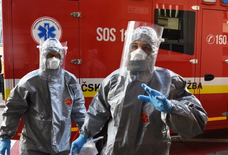 Ak uvidíte takto „vyobliekaných“ hasičov, zvedavé hlúčiky nevytvárajte. Celkom určite idú k odberu vzoriek u obyvateľov s podozrením na COVID – 19.