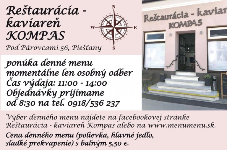 V reštaurácií Kompas si prídete na svoje aj v prípade, že obľubujete mäsové pokrmy, ale aj vtedy, ak máte chuť najesť sa bezmäsitej stravy. Obed si môžete vyzdvihnúť priamo v prevádzke.